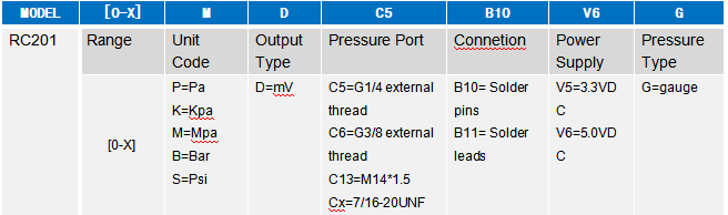 Example: RC201-[0-7]M-D-C5-B10-V6-G (RC201miniature micro-melt pressure sensor, range: 0-7MPa, output: Mv, pressure port: G1/4, connection: solder pins, power supply: 5V, gauge) Note: 1. Please note that the tested medium shall be compatible with the part contacting the product and medium, while ordering. 2. For special requirements, please consult with our company and indicate in the order.