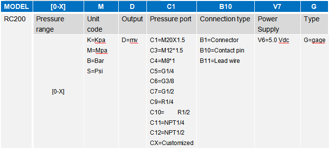 Example: RC200-[0-40]MDC1B11V6G (RC200 Standard Micro-melt Pressure Sensor, Range: 0-40 MPa, Output: mv, Pressure Port: M20*1.5, Connection: Lead wire, Power Supply: 5.0 Vdc, gage) Note: We are the manufacturer, if any special needs, please contact us.
