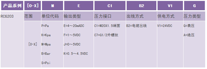 举例:RC6203-[0-1]M-E-C1-B2-V1-G (RC6203工业型压力变送器(2088壳体),量程0-1MPa, E=4~20mADC输出,压力接口M20*1.5端面,电缆出线,24V供电, 表压) 注:特殊需求,请与生产商联系。 1、选型时请注意被测介质要与产品与介质相接触的部分相兼容。 2、需要零位压力为负压的变送器时,请在订货时注明量程范围。 3、特殊要求,请与本公司商洽,并在订单中予以注明。