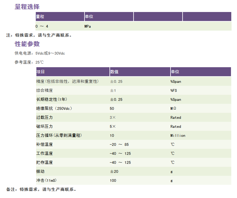 特点 1.LNG专用压力测量 2.玻璃微熔技术,一体化结构 3.全温区补偿 4.耐低温能力强 5.体积小,安装方便 6.工作温度范围宽 产品说明 RC6103系列变送器压力座采用17-4PH不锈钢单件一体式结构加工而成,一体化的不锈钢膜片使之过载性能远高于扩散硅、陶瓷等常用芯体,并且其压力接口无焊缝、无硅油或其他有机物,密封性能好。传感器敏感器件采用玻璃微熔技术牢固烧结在压力座上,使传感器耐高低温、抗震动等性能大幅度提升,保证了变送器在工业恶劣环境中使用的长期稳定性、可靠性,经久耐用。在标准净化生产过程中,各项参数严格受控,整个产品经过了元器件、半成品及成品的严格测试及老化筛选,性能稳定可靠。 RC6103型压力变送器由微熔压力传感器芯体及高精度数字集成电路组成,能够精确测量并迅速提供输出信号。该型号压力变送器通过专用的电路模块,进行滤波和噪声抑制,并提供温度补偿,使该产品具有耐高低温、抗过载、抗干扰、寿命长、性能价格比高等特点。典型应用:LNG压力测量、天然气控制系统、液化气燃料车及液化气运输车的压力监控和测量。