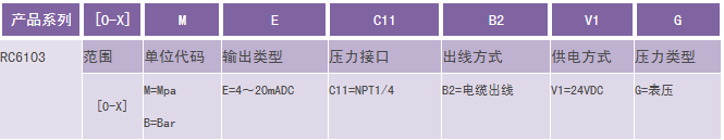 举例:RC6103-[0-4]M-E-C11-B2-V1-G (RC6103LNG专用压力变送器,量程0-4MPa, E=4~20mADC输出,压力接口NPT1/4,电缆出线,24VDC供电, 表压) 备注:详情请向供应商索要产品选型表。 1、选型时请注意被测介质要与产品与介质相接触的部分相兼容。 2、特殊要求,请与本公司商洽,并在订单中予以注明。