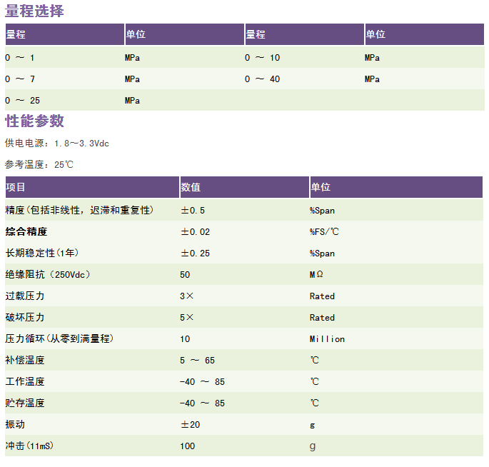 特点 1.不锈钢单件一体化结构,无O型圈 2.高压力 3.适应恶劣环境 4.高可靠性和稳定性 5.宽量程 6.过载能力强 7.工作温度范围宽 产品说明 RC6106微型数字输出压力变送器是大连睿科电子公司新一代智能数字产品,具有高精度、高可靠性、使用和安装方便等特点。产品宽电压,低功耗,并具有多级防护设计,抗干扰强。标准IIC总线,*400K速率,100 次/秒的采集速率,功耗小于2mA,标准IIC通信协议使该变送器特别适用于计算机控制系统中。 RC6106微型数字输出压力变送器座采用17-4PH不锈钢单件一体式结构加工而成,一体化的不锈钢膜片使之过载性能远高于扩散硅、陶瓷等常用芯体,并且其压力接口无焊缝、无硅油或其他有机物,密封性能好。传感器敏感器件采用玻璃微溶技术牢固烧结在压力座上,使传感器耐高温、抗震动等性能大幅度提升,保证了变送器在工业恶劣环境中使用的长期稳定性、可靠性,经久耐用。在标准净化生产过程中,各项参数严格受控,整个产品经过了元器件、半成品及成品的严格测试及老化筛选,性能稳定可靠。
