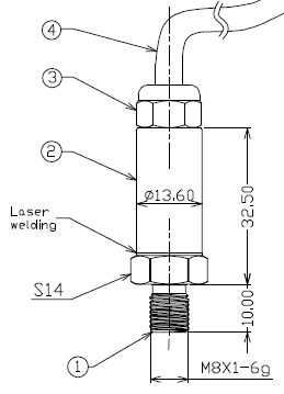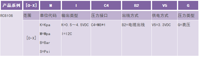 举例:RC6106-[0-1]M-I-C4-B2-V5-G (RC6106微型数字输出压力变送器,量程0-1MPa,I2C输出,压力接口M8*1,电缆出线,3.3V供电, 表压) 1、选型时请注意被测介质要与产品与介质相接触的部分相兼容。 2、需要零位压力为负压的变送器时,请在订货时注明量程范围。 3、特殊要求,请与本公司商洽,并在订单中予以注明。