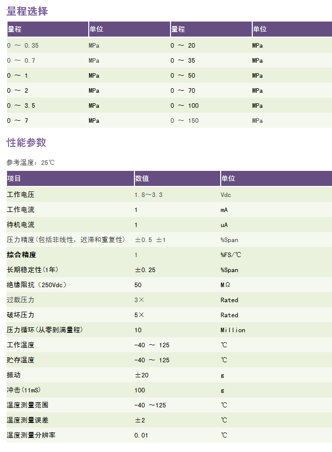 特点 1.不锈钢单件一体化结构,无O型圈 2.高压力 3.适应恶劣环境 4.数字信号输出 5.高可靠性和稳定性 6.宽量程 7.过载能力强 8.工作温度范围宽 9.温度压力一体式设计 产品说明 RC6107型数字输出压力变送器是新一代智能数字产品,具有高精度、高可靠性、使用和安装方便等特点。产品宽电压,低功耗,并具有多级防护设计,抗干扰强。标准IIC总线,*400K速率,50 次/秒的采集速率,工作的时候功耗小于1mA,待机电流1uA,标准IIC通信协议使该变送器特别适用于计算机控制系统中。 RC6107型数字输出压力变送器压力座采用17-4PH不锈钢单件一体式结构加工,过载性能高,并且其压力接口无焊缝、无硅油或其他有机物,密封性能好。传感器敏感器件采用玻璃微熔技术牢固烧结在压力座上,使传感器耐高温、抗震动等性能大幅度提升,保证了变送器在工业恶劣环境中使用的长期稳定性、可靠性,经久耐用。在标准净化生产过程中,各项参数严格受控,整个产品经过了元器件、半成品及成品的严格测试及老化筛选,性能稳定可靠。