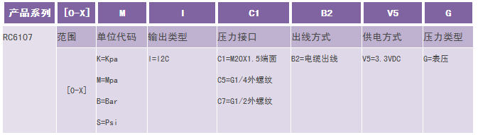 举例:RC6107-[0-1]M-I-C1-B2-V5-G (RC6107数字输出压力变送器,量程0-1MPa,I2C输出,压力接口M20*1.5端面,电缆出线,3.3V供电, 表压) 1、选型时请注意被测介质要与产品与介质相接触的部分相兼容。 2、需要零位压力为负压的变送器时,请在订货时注明量程范围。 3、特殊要求,请与本公司商洽,并在订单中予以注明。