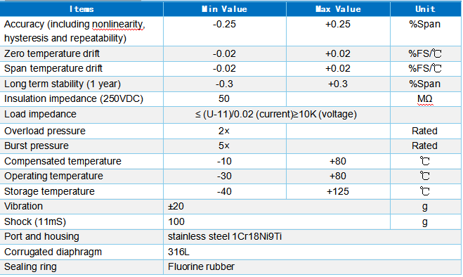 Features Whole stainless steel structure design, small size, light weight,easy to install Laser welding, fully sealed structure, housing protection grade IP65 316L stainless steel isolation diaphragm Adapt to harsh environment Advanced anti-interference and anti-surge circuit protection Excellent anti-shock, anti-overload, anti-vibration and corrosion resistance It can be adjusted and displayed on site Description The sensitive element of RC6401 diffused silicon differential pressure transmitter is a solid-state piezoresistive sensitive chip filled with silicone oil between the chip and two corrugated diaphragms. The measured differential pressure acts on the corrugated diaphragms at both ends, and the differential pressure is transmitted to the sensitive chip through silicone oil. The sensitive chip is connected to the special amplifying circuit through a wire. This product realizes the conversion of differential pressure and electrical signal with the piezoresistive effect of semiconductor silicon material. Since there is a good linear relationship between the signal output from the Wheatstone bridge on the sensitive chip and the differential pressure, so the accurate measurement of the measured differential pressure can be realized. Range Option