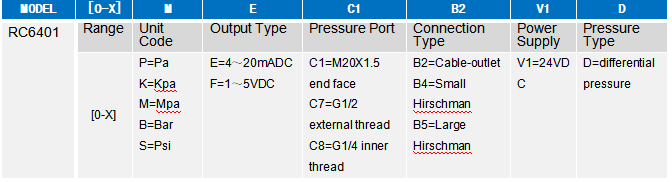 Example: RC6401-[0-1]M-E-C1-B2-V1-D (RC6401 Diffused Silicon Differential Pressure Transmitters, range: 0-1MPa, output: 4~20mADC, pressure port: M20*1.5 end face, connection: cable-outlet, power supply: 24V, differential pressure) Note: 1. Please note that the tested medium shall be compatible with the part contacting the product and medium, while ordering. 2. For special requirements, please consult with our company and indicate in the order. |