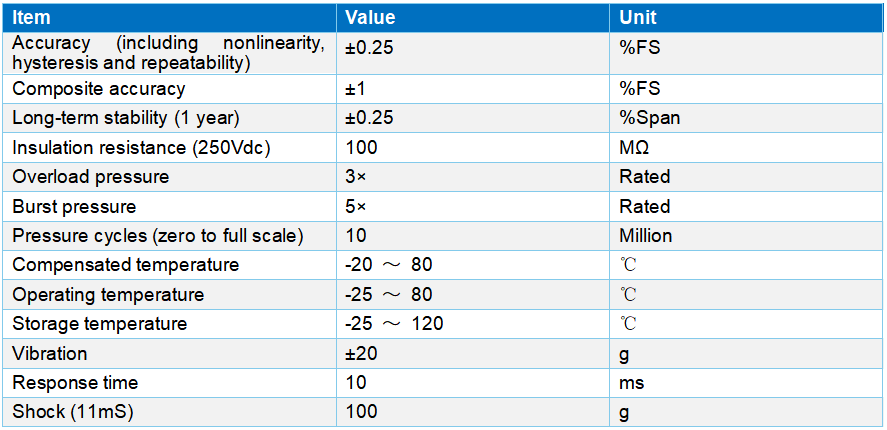 Features Stainless steel single piece integrated structure, no O-rings Absolute pressure Insulation resistance ≥ 100MΩ@250VDC Strong overload capacity High stability and reliability Wide operating temperature range Description