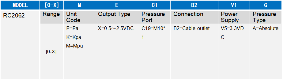 Example: RC2062-[0-1]M-X-C19-B2-V5-A (RC2062 pressure transmitter, range: 0-1MPa, output: 0.5-2.5V, pressure port: M10*1, connection: cable-outlet, power supply: 3.3V, absolute)