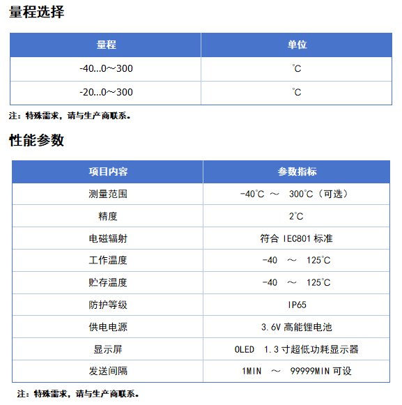 举例:RC9205-(0-100)MD8I0V4(RC9205防爆型无线温度变送器,温度范围0-100度,输出433M,,护管直径Φ8,安装方式固定螺纹M20*1.5,护管插深100mm,供电方式内置电池) 注:特殊需求,请与生产商联系。 1、选型时请注意被测介质要与产品与介质相接触的部分相兼容。