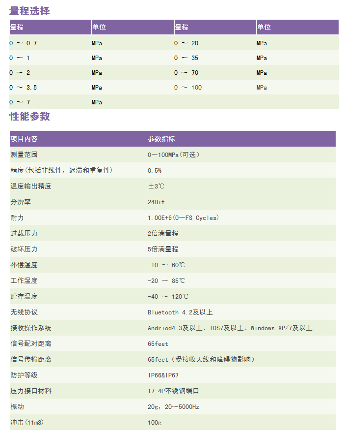 Product OverviewRC9401无线蓝牙型中高压压力变送器采用标准的2.4GHz无线通信协议,低功耗,电池使用寿命长。芯体采用硅微熔工艺,特点是不锈钢单件一体化结构;无O型圈、无焊缝、无硅油;压力范围广;量程覆盖范围宽;过载能力强。