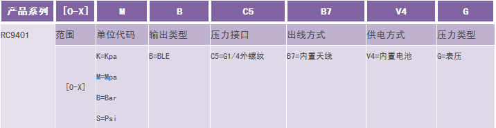 举例:RC9401-[0-1]M-B-C5-B7-V4-G(RC9401无线蓝牙型中高压无线压力变送器,量程1Mpa;输出蓝牙;压力接口G1/4外螺纹,内置电池;表压) 注:特殊需求,请与生产商联系。 1、选型时请注意被测介质要与产品介质相接触的部分相兼容。 2、特殊要求,请与本公司商洽,并在订单中予以注明。 |