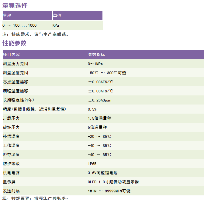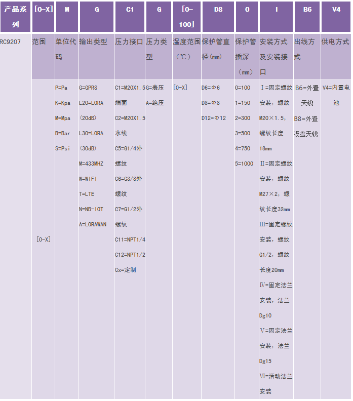 举例:RC9207-[0-1]M-G-C1-G-[0-100]-D8 -0-I-B6-V4(RC9207防爆型无线低压压力温度变送器;压力范围0-1MPa;输出GPRS;螺纹接口M20*1.5;表压;温度测量范围0-100°,Φ8保护管,固定螺纹安装,螺纹M20×1.5,螺纹长度18mm;外置天线;内置电池供电。) 注:特殊需求,请与生产商联系。 1、选型时请注意被测介质要与产品与介质相接触的部分相兼容。 2、需要零位压力为负压的变送器时,请在订货时注明量程范围。 3、特殊要求,请与本公司商洽,并在订单中予以注明。