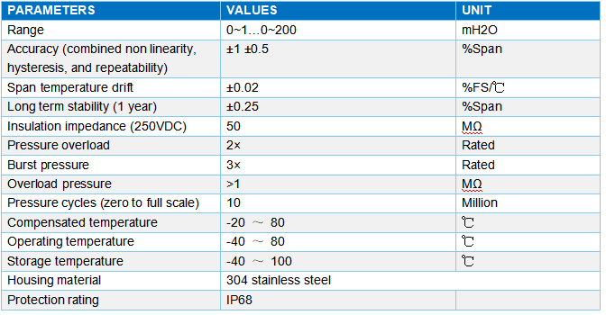 Features Small volume High-precision High reliability and stability Compact structure and convenient installation Directly put into the liquid for use Description RC6601 series liquid level transmitters use a high-performance diffusion silicon piezoresistive pressure sensor as a measuring element to accurately measure the static pressure of the liquid, which is proportional to the liquid level depth, and converts it into a standard signal output through ASIC amplifier circuit. The linear correspondence between the output signal and the liquid depth is established to realize the measurement of the liquid depth, and is compatible with various acquisition devices. Standard Ranges