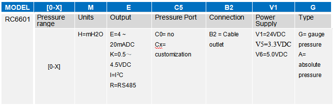 For example : RC6601- [ 0-1 ] H-E-C0-B2-V1-G ( RC6601 series general liquid level transmitter, measuring range : 0~1 mH2O, output: 4~20mA, pressure interface: no, connection: cable outlet, [ marked line length ] power supply: 24VDC, gauge pressure ) Note: Please contact us for the code confirmation 1. Please kindly note that the tested medium shall be compatible with the part contacting the product and medium. 2. For special requirements, please consult with our company and indicate in the order. |