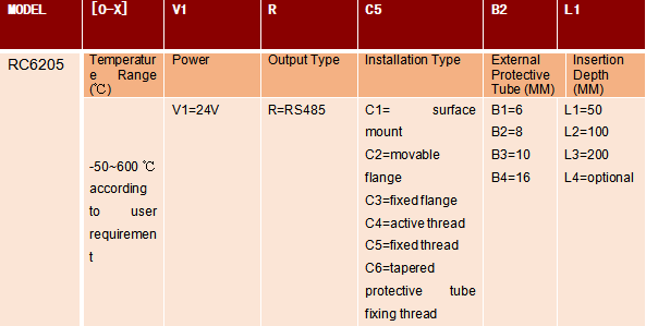 ![]() Example: RC6205-[0-100]V1-R-C5-B2-L1 (RC6204 industrial temperature transmitter (2088 housing), range: 0-100℃, output: RS485, port: M20*1.5 end face, power supply: 24V, diameter of protective tube: 8mm, insertion depth: 50mm) Note: 1. Please note that the tested medium shall be compatible with the part contacting the product and medium, while ordering. 2. For special requirements, please consult with our company and indicate in the order.
