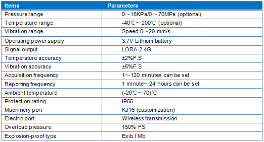 Features Multiple parameters can be measured Support multiple wireless transmission modes Wireless communication distance≤200m (LORA) Adopting high performance MEMS chip, with high measurement accuracy and strong anti-interference ability 24 Bit high precision ADC acquisition High energy lithium battery power supply, long standby time Low power consumption, static current up to 15uA Reliable structure, good explosion-proof performance Description